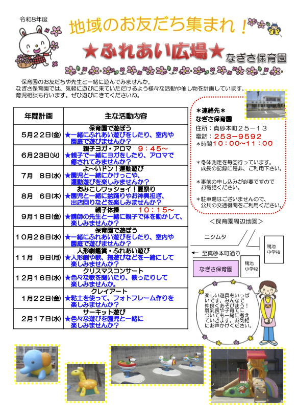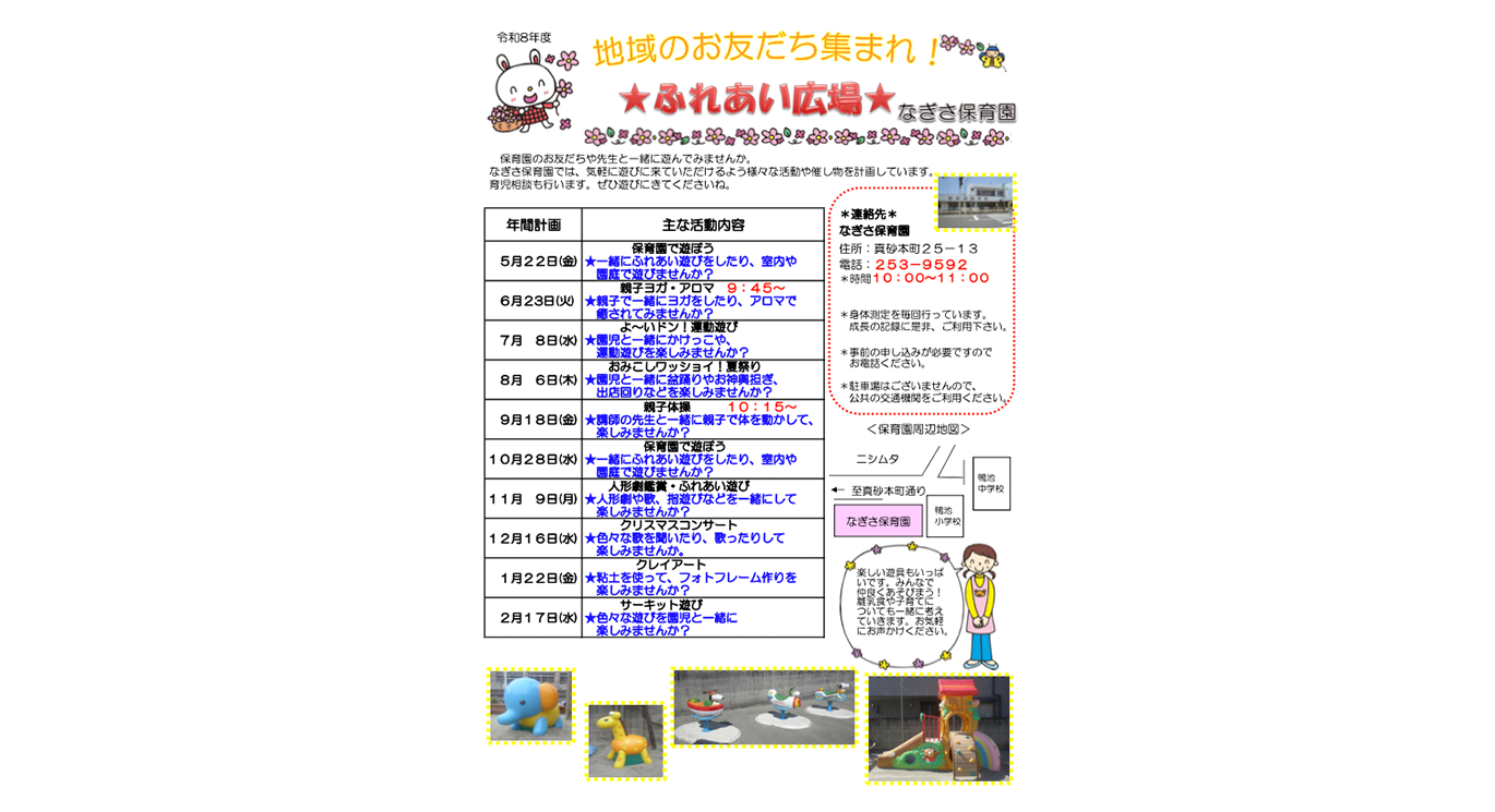 開放感のある園庭に子ども達の楽しそうな声が響き渡っているなぎさ保育園。 家庭的な雰囲気の中で、年長、年中さんは小さなお友達にお世話をしてくれ「思いやりのある優しい気持ち」が自然と育まれています。子ども達の「やってみたい!できたよ☺」という好奇心や達成感を大切にしながら、自分らしく過ごせる環境と保育を大切にして、40名の子ども達の健やかな成長を保護者の皆様と共に喜んでまいりたいと思います。