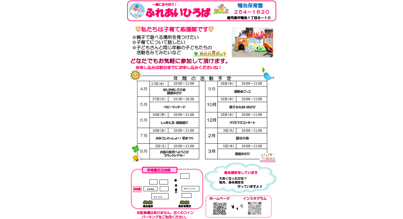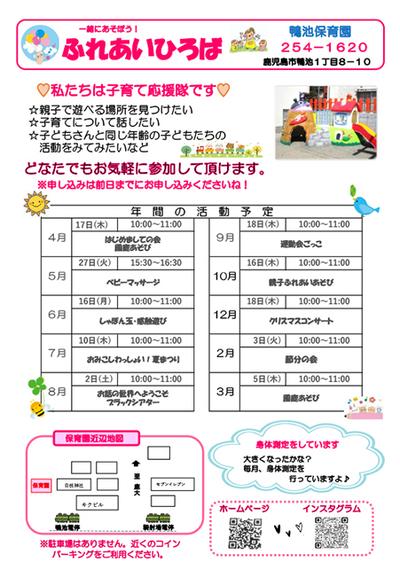 鴨池保育園は、地域の子育て中の皆様が気軽に遊びにこられる場所・相談しやすい場所として、親子で楽しく集える場を提供しています。同年齢の子ども達の活動をみてみたい・お友達をつくりたいなど、皆様のお越しをお待ちしています♪