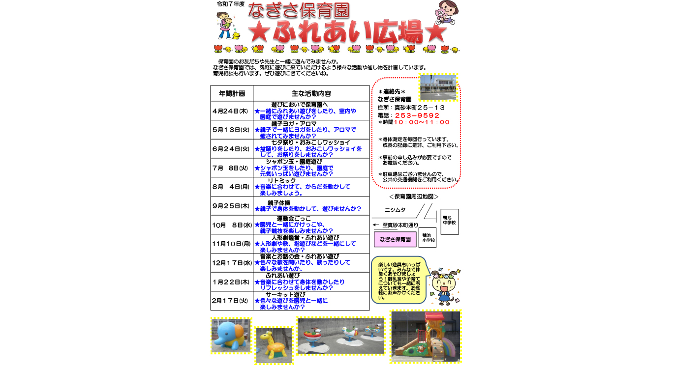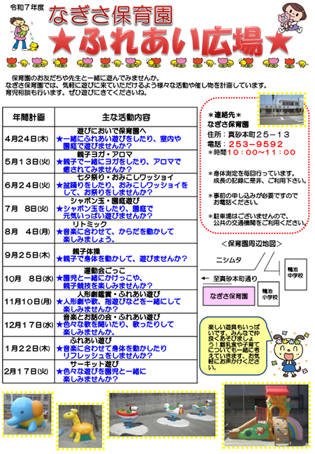 なぎさ保育園は、地域の子育て中の親子の皆様が気軽に遊びにこれる場所・相談しやすい場所としてR7年度も親子で楽しめる遊びを計画しています。ぜひ遊びに来てくださいね。