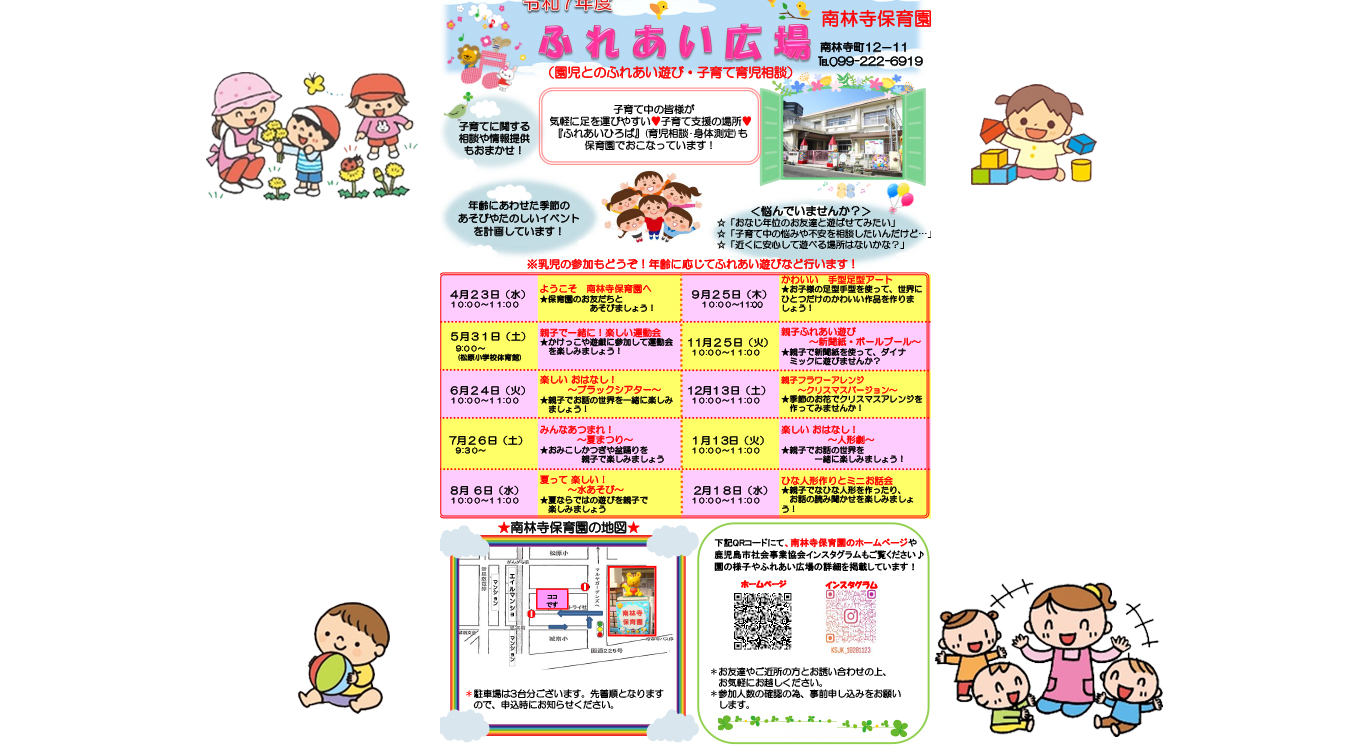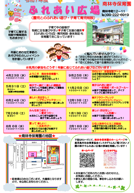 南林寺保育園は、地域の子育て中の親子の皆様が気軽に遊びにこれる場所・相談しやすい場所として提供させていただいています!