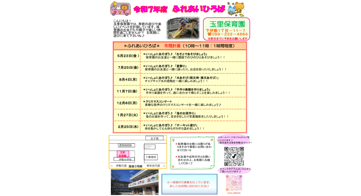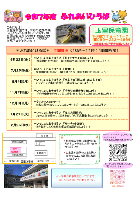 玉里保育園は、地域の子育て中の親子の皆様が気軽に遊びにこれる場所!相談できる場所!親子の交流の場所!と身近に感じてもらえるように、R7年度も親子で楽しくできる遊びを計画しています。保育園の子どもたちとお待ちしています。お気軽に遊びにきてくださいね♡