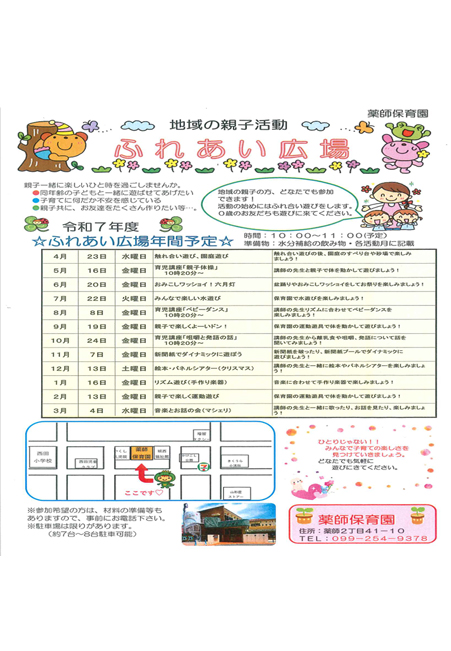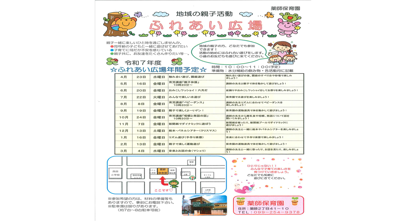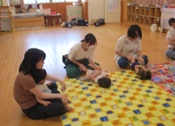 • 定期的に地域の乳幼児を持つ保護者に対して育児講座の開催や、育児と仕事の両立支援に関する情報提供や毎月保育園開放(通称:ふれあい広場)を行っています。