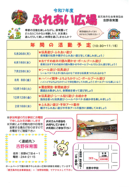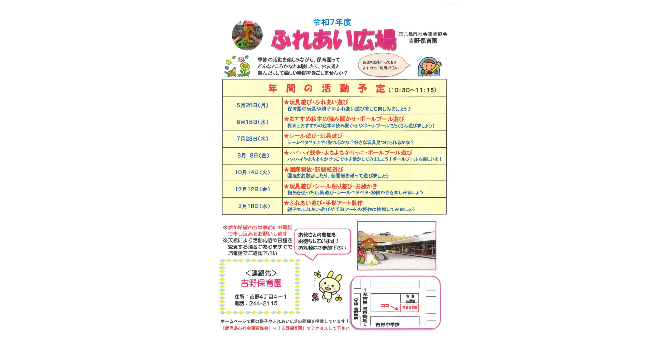 吉野保育園では、地域の子育て中の親子の皆様が気軽に遊びに来ていただける活動を設けています!R7年度も楽しい遊びを計画しています。ぜひご参加ください!