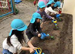 園庭の花々が色とりどりに咲きほこる中、今年は新しいお友だち14名を迎え、令和7年度がスタートしました。シンボルツリー「くすのきさん」が見守る中、子ども達は、新しいお友だちや先生たちとのやりとりに瞳を輝かせ、新しいクラスカラーのネームをつけて、進級したことを喜んでいます。