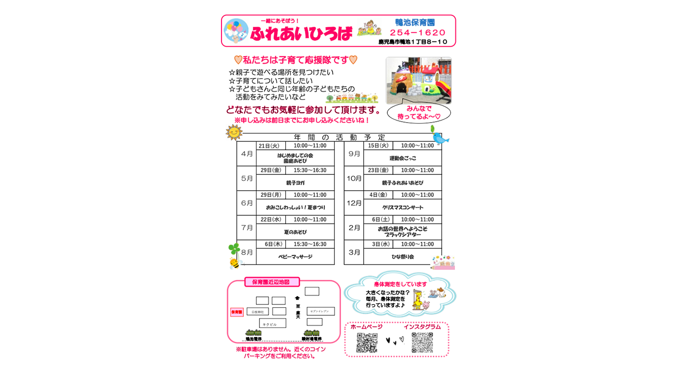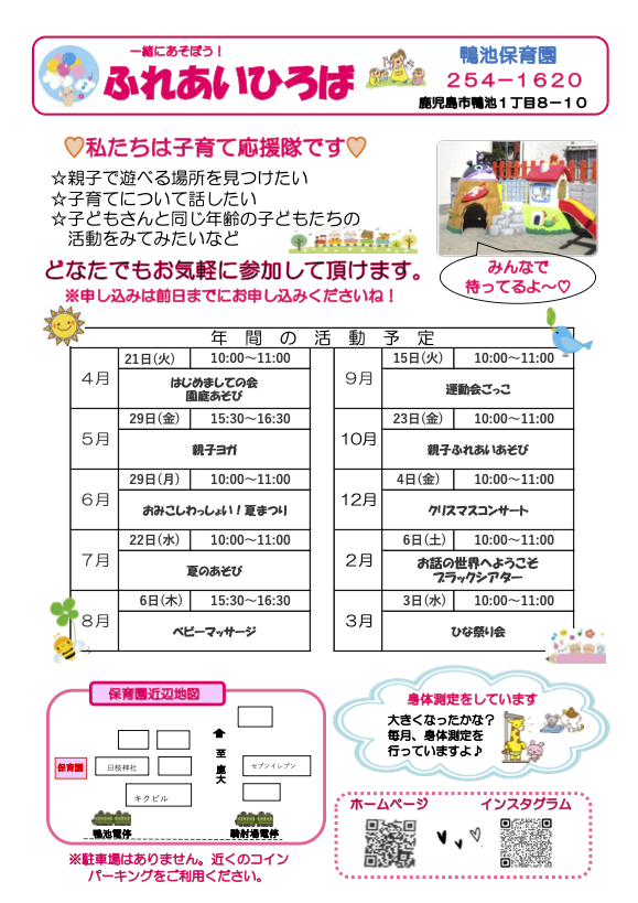 鴨池保育園は、地域の子育て中の皆様が気軽に遊びにこられる場所・相談しやすい場所として、親子で楽しく集える場を提供しています。同年齢の子ども達の活動をみてみたい・お友達をつくりたいなど、皆様のお越しをお待ちしています♪