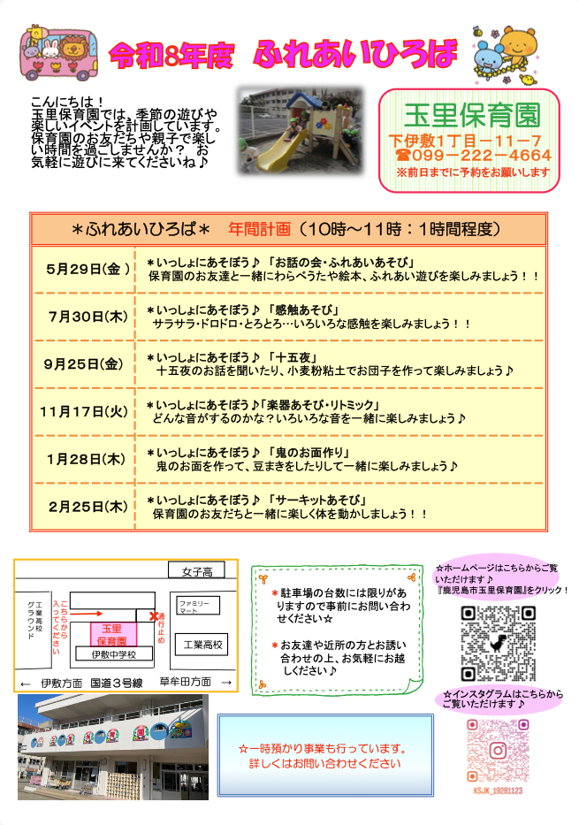 玉里保育園は、地域の子育て中の親子の皆様が気軽に遊びにこれる場所!相談できる場所!親子の交流の場所!と身近に感じてもらえるように、R8年度も親子で楽しくできる遊びを計画しています。保育園の子どもたちとお待ちしています。お気軽に遊びにきてくださいね♡