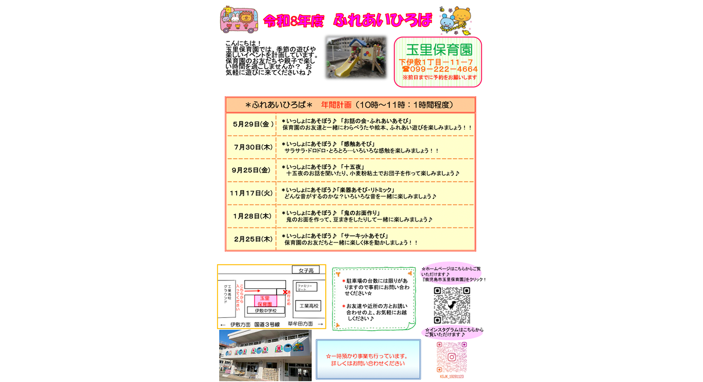 玉里保育園は、地域の子育て中の親子の皆様が気軽に遊びにこれる場所!相談できる場所!親子の交流の場所!と身近に感じてもらえるように、R8年度も親子で楽しくできる遊びを計画しています。保育園の子どもたちとお待ちしています。お気軽に遊びにきてくださいね♡