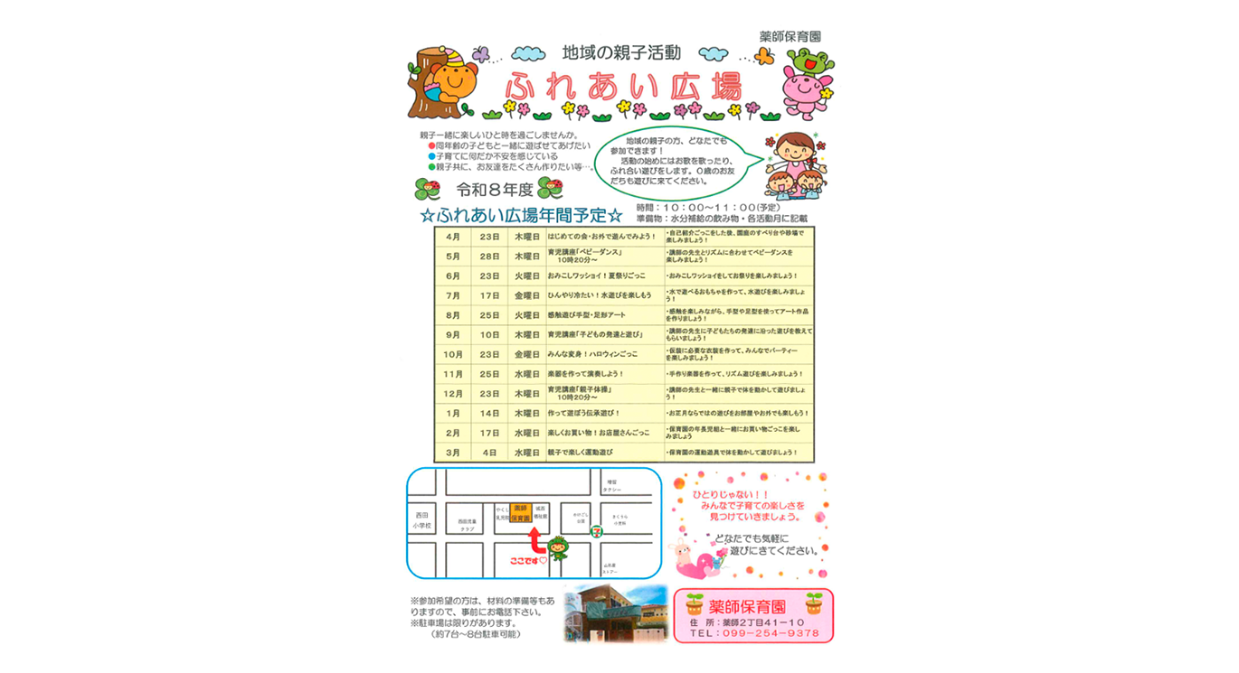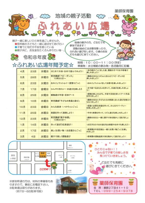 毎月1回、地域の親子の方々がわき合いあいと集い、保育園ならではの活動や園児と一緒に遊んだりします。よかったら、ぜひお父さんも一緒に遊びに来てください。前日までにお電話いただけると助かります。