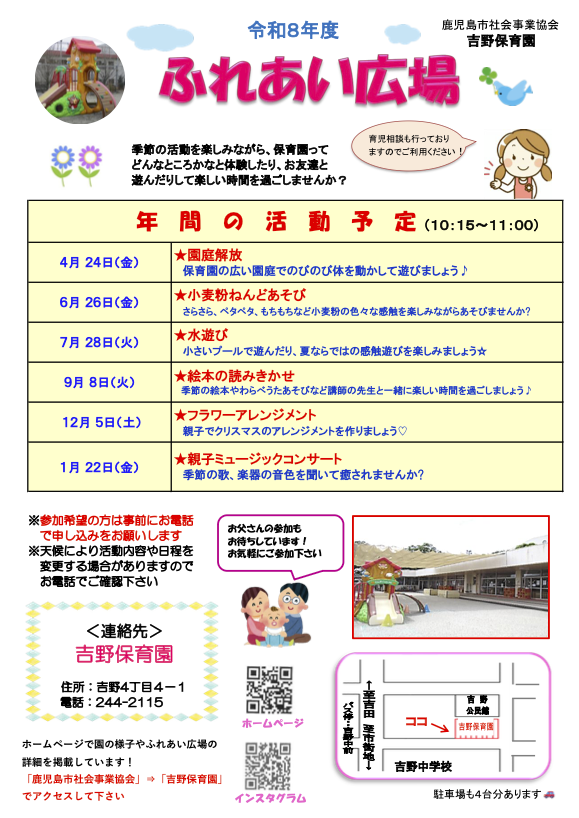 吉野保育園では、地域の子育て中の親子の皆様が気軽にあそびにきていただける活動を設けています。