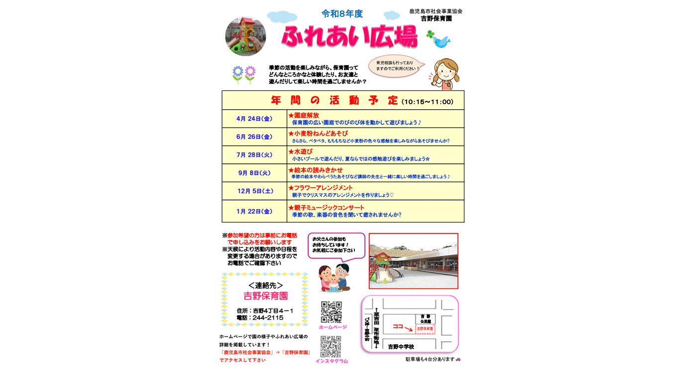 吉野保育園では、地域の子育て中の親子の皆様が気軽にあそびにきていただける活動を設けています。