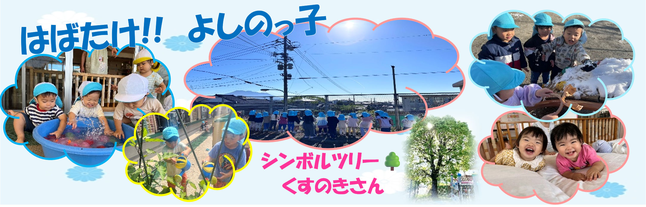 園庭から広大な桜島を眺め、シンボルツリー「くすのきさん」が見守る中、大好きなお友だちや先生たちと元気いっぱい笑顔いっぱいで過ごす「よしのっこ」!
